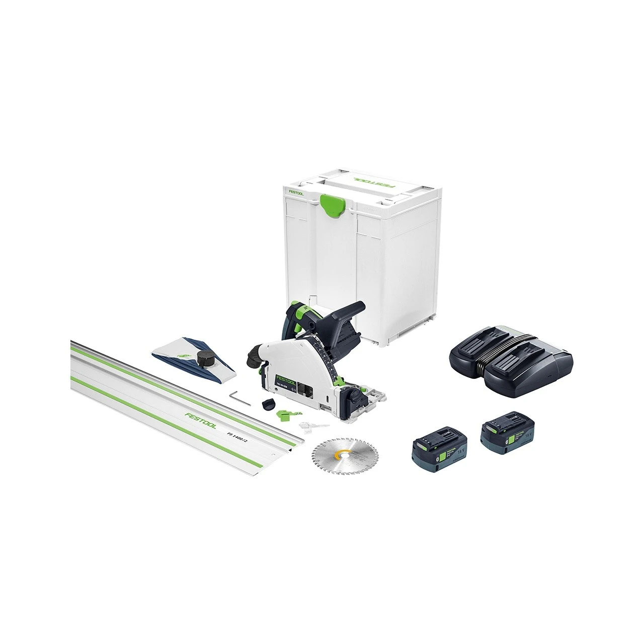 2 x Akkupack BP 18 Li 5,0 ASI, Schnellladegerät TCL 6 DUO, Kreissägeblatt WOOD FINE CUT HW 160×1,8×20 WD42, Splitterschutz, Sichtfenster, Staubfangbeutel, Innensechskantschlüssel SW 5, Führungsschiene FS 1400/2, Systainer SYS3 M 437