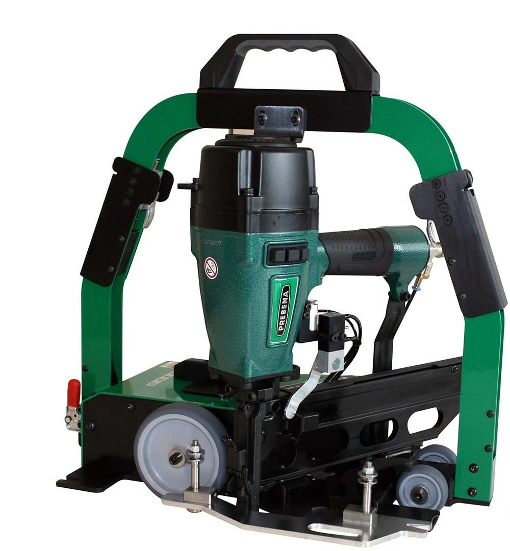 - Kein Elektroanschluss nötig, pneumatisch/mechanische Steuerung, Setzen der Klammer in genauen, regelmäßigen Abständen, exakte Einhaltung von Klammer- und Randabständen durch verstellbaren Seitenanschlag, Klammerwinkel 30° nach Eurocode 5